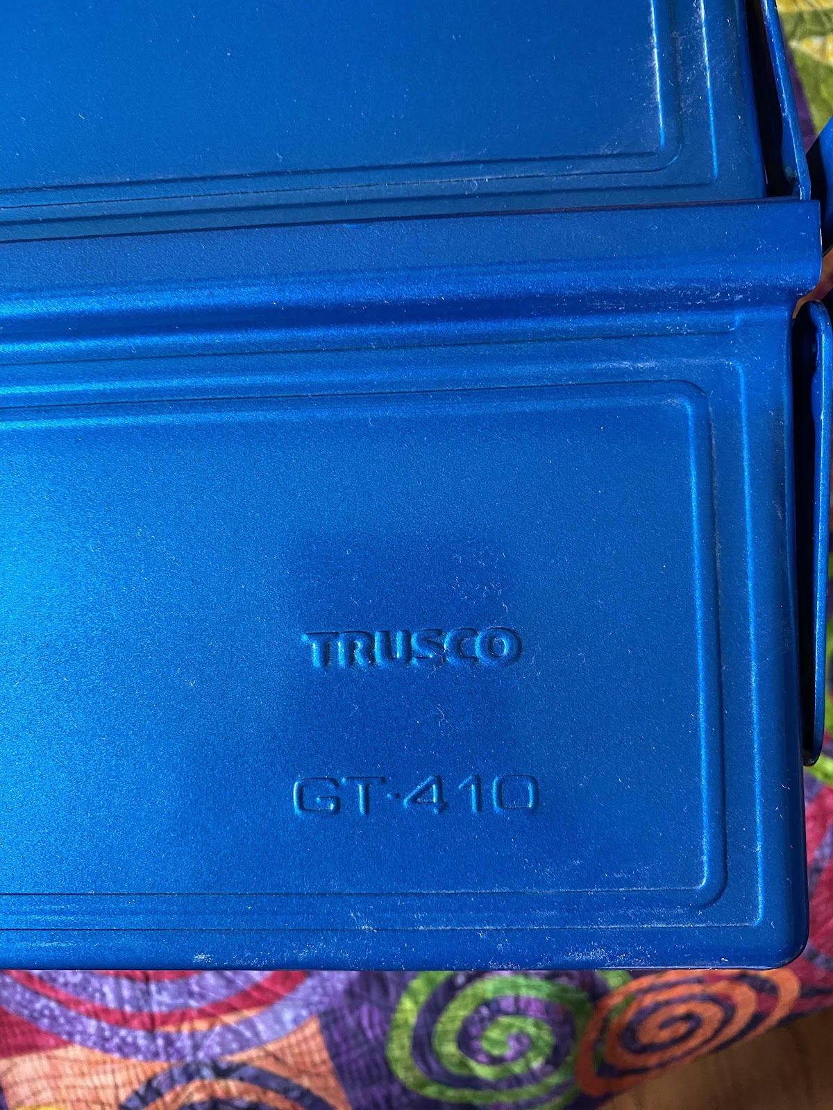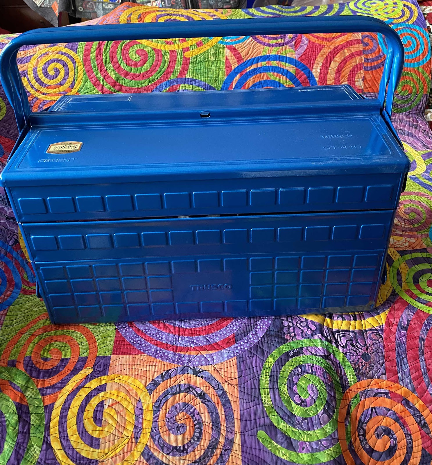 Trusco is the manufacturer and you can look for similar models on Toyo, both made in Japan. My first ‘new’ tool box. And yes, that is one of my quilts underneath it. I used to teach a class about how to make this quilt. Now, I am going to hang it in our house!